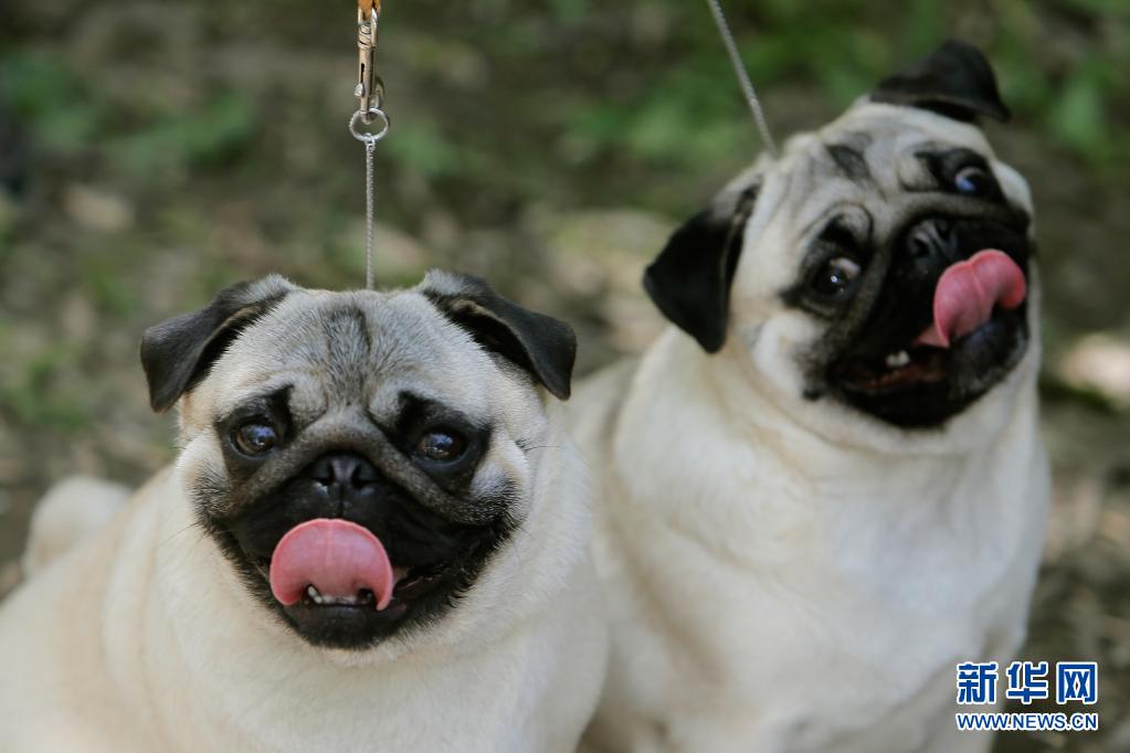 5月23日,兩只巴哥犬在羅馬尼亞首都布加勒斯特參加選美比賽。新華社發(克里斯泰爾攝)