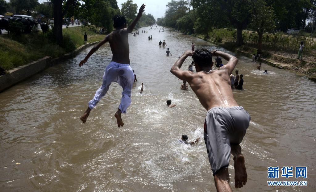 5月30日,年輕人跳入巴基斯坦城市拉合爾的溝渠中享受清涼。