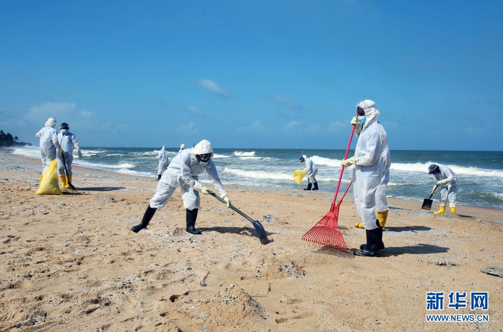 6月2日,工作人員在斯里蘭卡科倫坡一處沙灘清理貨船燃燒產生的廢物。