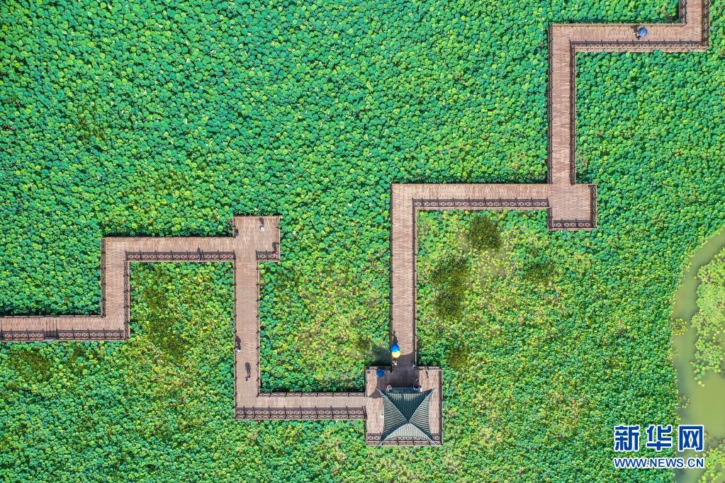 這是南寧市南湖內(nèi)的觀景棧道(6月14日攝,無人機(jī)照片)。新華社記者 徐海濤 攝