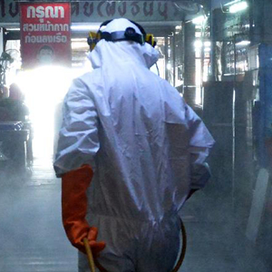 6月21日,工作人員在泰國首都曼谷一處生鮮市場進行消毒。