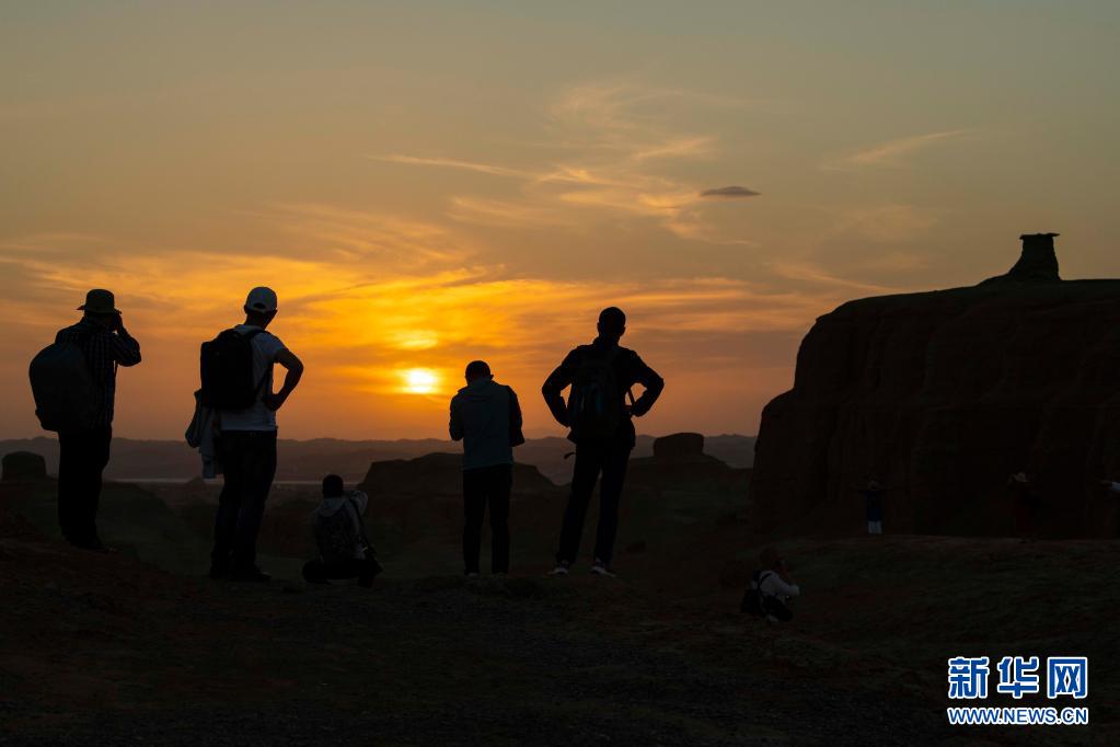 游客在新疆克拉瑪依烏爾禾世界魔鬼城景區欣賞日落(6月21日攝)。