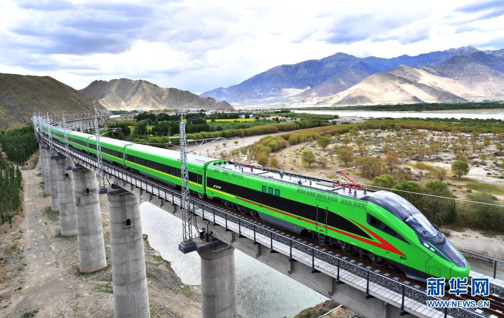 試運行的復(fù)興號列車行駛在西藏山南市境內(nèi)(6月16日攝)。
