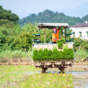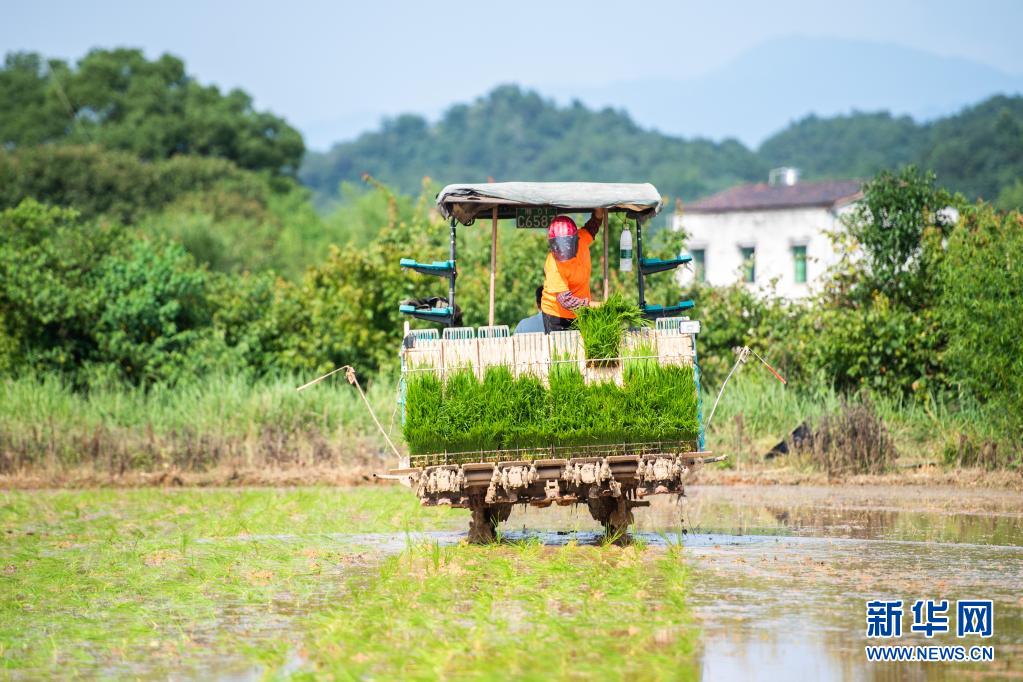 6月26日,湖南瀏陽龍伏鎮新開村村民駕駛插秧機在田間插秧。