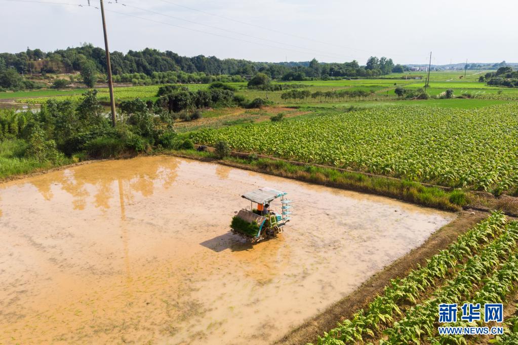 6月26日,湖南瀏陽龍伏鎮新開村村民駕駛插秧機在田間插秧(無人機照片)。