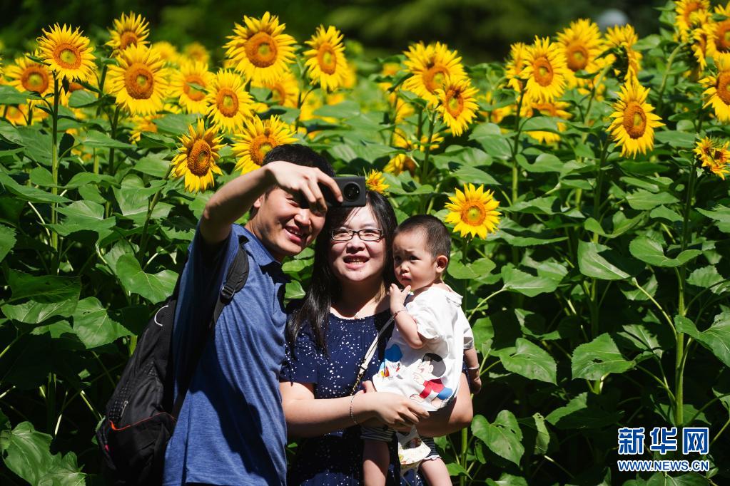 7月4日,游客在北京奧林匹克森林公園北園的向日葵花田旁自拍。