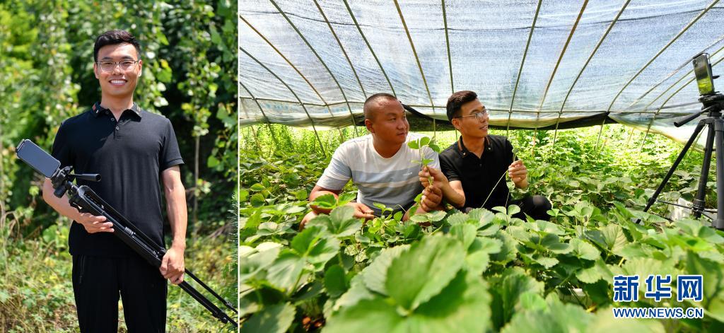 拼版照片:左圖為張成蘊(yùn)在山西省運(yùn)城市絳縣臨澮村的田間;右圖為張成蘊(yùn)(右)在大棚里錄制農(nóng)業(yè)科普視頻(7月14日攝)。今年34歲的張成蘊(yùn)大學(xué)畢業(yè)后,一直熱衷于用拍攝視頻的方式宣傳家鄉(xiāng)的風(fēng)土人情。2018年8月,他開(kāi)始在社交平臺(tái)上幫助鄉(xiāng)親們直播帶貨,真誠(chéng)的笑容、優(yōu)質(zhì)的產(chǎn)品和專(zhuān)業(yè)的知識(shí)是他吸引粉絲的“訣竅”。