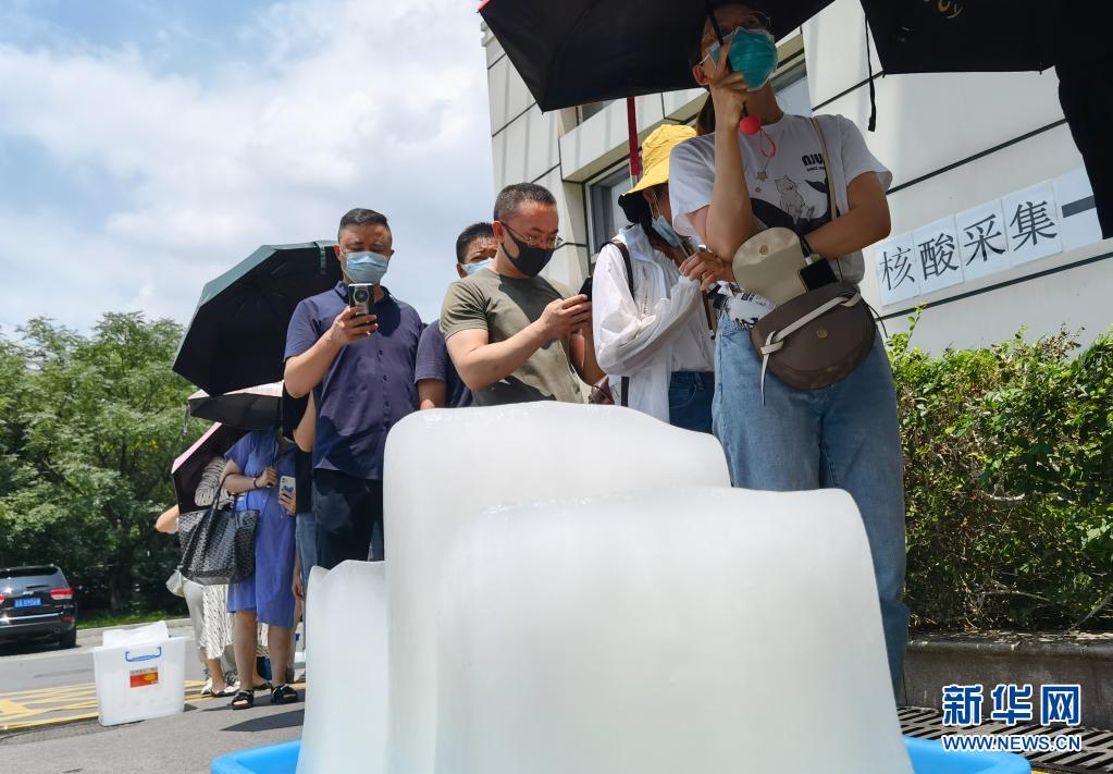 江蘇省南京市于7月21日開始對全市常住人口、外來人員開展全員核酸檢測。目前正值盛夏,氣溫較高,在南京市第一醫(yī)院河西院區(qū)核酸檢測點,工作人員專門為排隊等候的市民準(zhǔn)備了冰塊降溫。