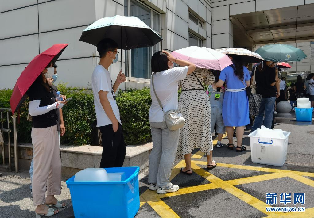 江蘇省南京市于7月21日開始對全市常住人口、外來人員開展全員核酸檢測。目前正值盛夏,氣溫較高,在南京市第一醫院河西院區核酸檢測點,工作人員專門為排隊等候的市民準備了冰塊降溫。