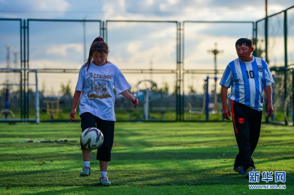 7月26日,吉布斯樂(lè)瑪(左)和父親嘎拉巴特爾在錫尼河西蘇木一處足球場(chǎng)踢球。