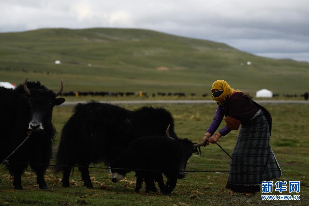 8月3日,在瑪沁縣當洛鄉貢龍村的夏季草場上,牧民在拴牦牛。