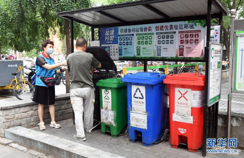 在北京市海淀區薊門里社區,董星梅(左)指導社區居民進行垃圾分類投放(8月11日攝)。