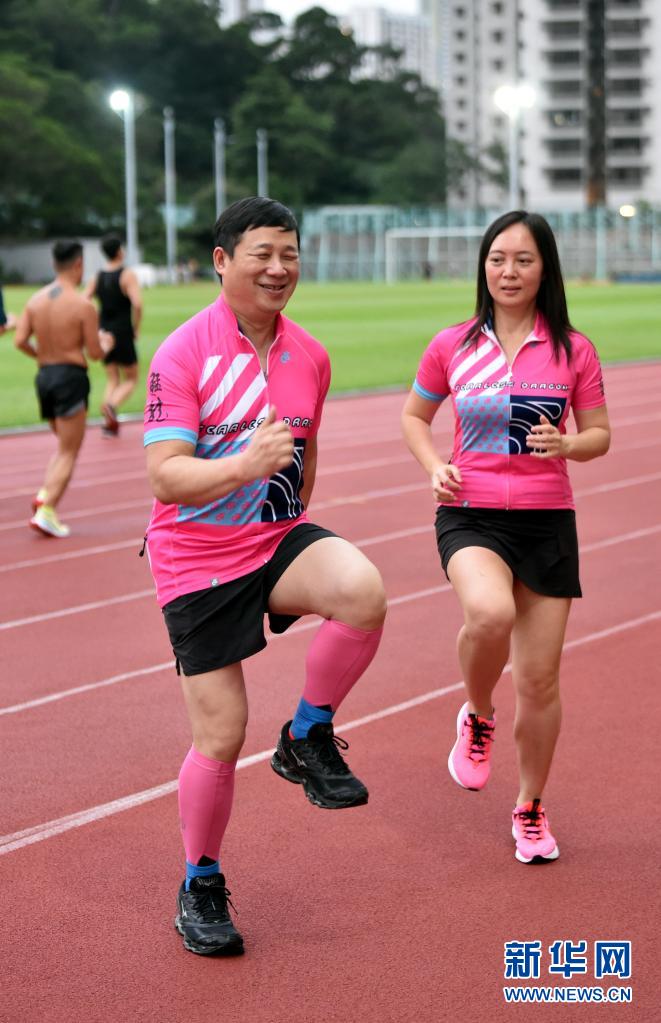 猛龍長跑隊創(chuàng)辦人莫儉榮(左)與領(lǐng)跑員嚴(yán)惠茵訓(xùn)練前進行熱身(7月29日攝)。
