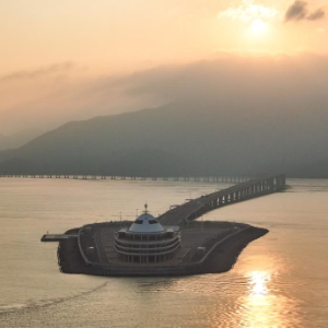 晨曦中的港珠澳大桥和蓝海豚岛(10月19日摄,无人机照片)。港珠澳大桥是全运会公路自行车项目途经地,一桥串联粤港澳三地。