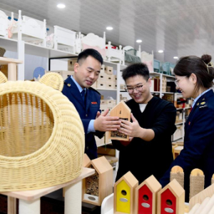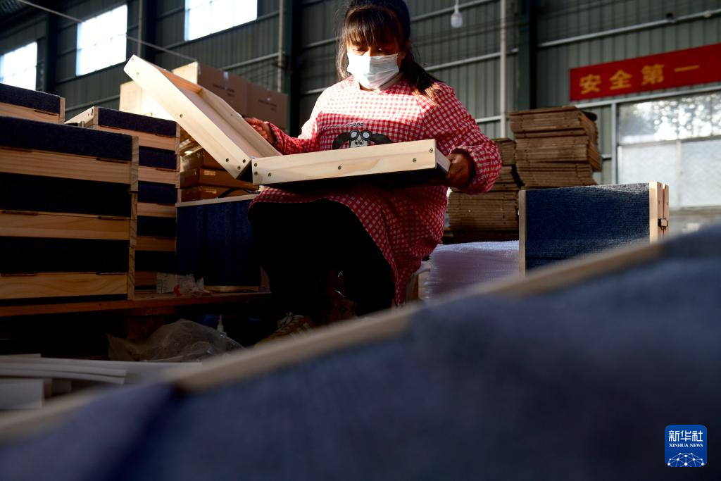 11月28日,在曹县海纳木制工艺品有限公司,工作人员包装宠物家居产品。