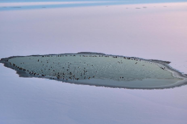 11月27日,一群绿头鸭聚集在降雪后的松花江哈尔滨段未结冰水域觅食、休憩。落日金晖映照下,白雪、寒江和绿头鸭组成了一幅寒江“戏雪”画卷。
