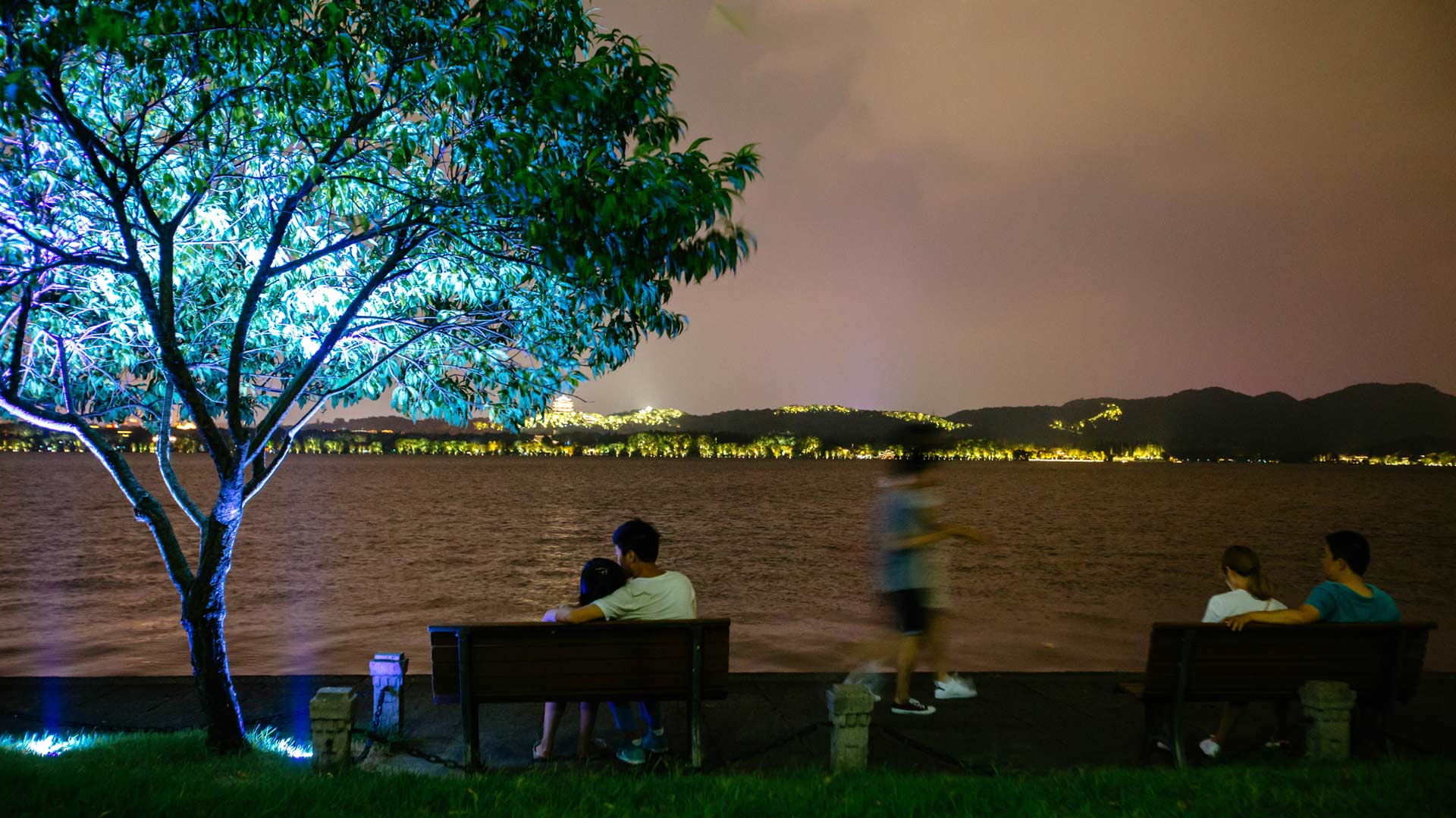 8月26日晚,市民在西子湖畔欣賞夜色。一枕錢塘江,懷擁西湖月,牽著運河走,挽著西溪眠……到訪杭州,游人無不感嘆驚奇這座城市的美麗與優雅。新華社記者張鋮攝