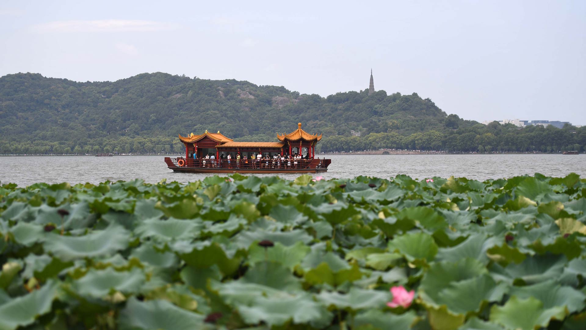 游客乘坐游船在西湖上游覽(8月27日攝)。 “三面云山一面城”,西湖的美麗自古就為眾多的作家和藝術家所稱頌。“西湖十景”被認為是“天人合一”最理想最經典的景觀體現。(新華社記者 陳曄華 攝)