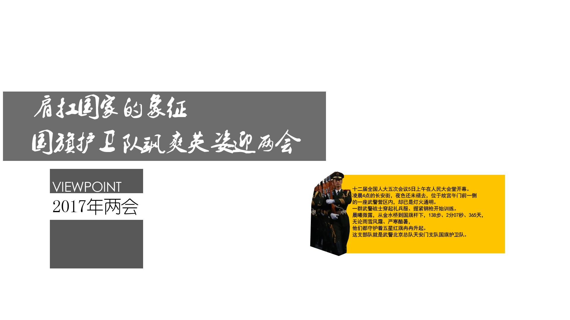 2017年3月5日,第十二屆全國(guó)人民代表大會(huì)第五次會(huì)議在人民大會(huì)堂開幕。凌晨4點(diǎn)的長(zhǎng)安街,夜色還未褪去,位于故宮午門前一側(cè)的一座武警營(yíng)區(qū)內(nèi),卻已是燈火通明。一群武警戰(zhàn)士穿起禮兵服、握緊鋼槍開始訓(xùn)練。晨曦微露,從金水橋到國(guó)旗桿下,138步、2分07秒、365天,無論雨雪風(fēng)霜、嚴(yán)寒酷暑,他們都守護(hù)著五星紅旗冉冉升起。這支部隊(duì)就是武警北京總隊(duì)天安門支隊(duì)國(guó)旗護(hù)衛(wèi)隊(duì)。
