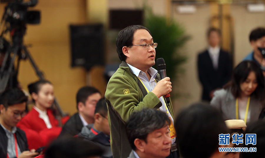 10月21日,十九大新聞中心舉辦集體采訪活動,主題為“農業科技創新”。圖為經濟日報記者提問。新華網 郝廣鵬攝