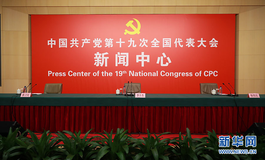 10月23日,十九大新聞中心舉辦記者招待會,邀請中央財經領導小組辦公室副主任楊偉民,環境保護部黨組書記、部長李干杰介紹踐行綠色發展理念,建設美麗中國有關情況,并回答記者提問。圖為記者招待會現場。新華網 郝廣鵬攝