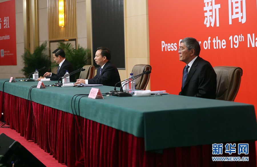 10月23日,十九大新聞中心舉辦記者招待會(huì),邀請(qǐng)中央財(cái)經(jīng)領(lǐng)導(dǎo)小組辦公室副主任楊偉民,環(huán)境保護(hù)部黨組書(shū)記、部長(zhǎng)李干杰介紹踐行綠色發(fā)展理念,建設(shè)美麗中國(guó)有關(guān)情況,并回答記者提問(wèn)。圖為記者招待會(huì)現(xiàn)場(chǎng)。新華網(wǎng) 郝廣鵬攝