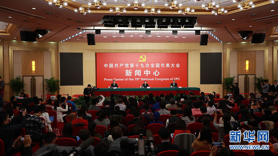 10月23日,十九大新聞中心舉辦記者招待會,邀請中央財經(jīng)領(lǐng)導(dǎo)小組辦公室副主任楊偉民,環(huán)境保護(hù)部黨組書記、部長李干杰介紹踐行綠色發(fā)展理念,建設(shè)美麗中國有關(guān)情況,并回答記者提問。圖為記者招待會現(xiàn)場。新華網(wǎng) 郝廣鵬攝