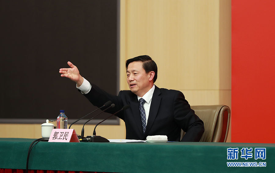 10月23日,十九大新聞中心舉辦記者招待會(huì),邀請(qǐng)中央財(cái)經(jīng)領(lǐng)導(dǎo)小組辦公室副主任楊偉民,環(huán)境保護(hù)部黨組書記、部長(zhǎng)李干杰介紹踐行綠色發(fā)展理念,建設(shè)美麗中國(guó)有關(guān)情況,并回答記者提問(wèn)。圖為主持人郭衛(wèi)民。新華網(wǎng) 郝廣鵬攝