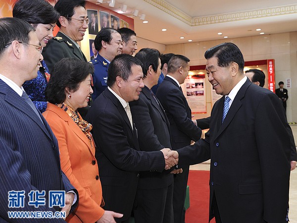 ??? 11月19日,全國政協主席賈慶林在北京全國政協禮堂參觀“善行天下·政協委員慈善公益事跡展”。這是賈慶林同從事慈善事業的政協委員代表親切握手。新華社記者 饒愛民 攝