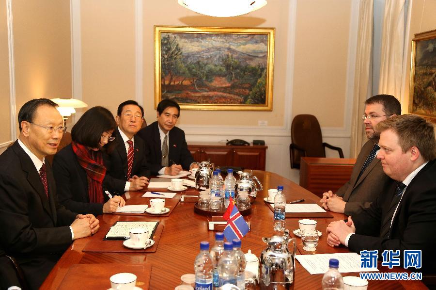 ??? 11月14日,在冰島首都雷克雅未克,中央書記處書記、全國政協(xié)副主席杜青林(左一)與冰島總理京勒伊格松(右一)舉行會(huì)談。新華社記者黃曉南攝