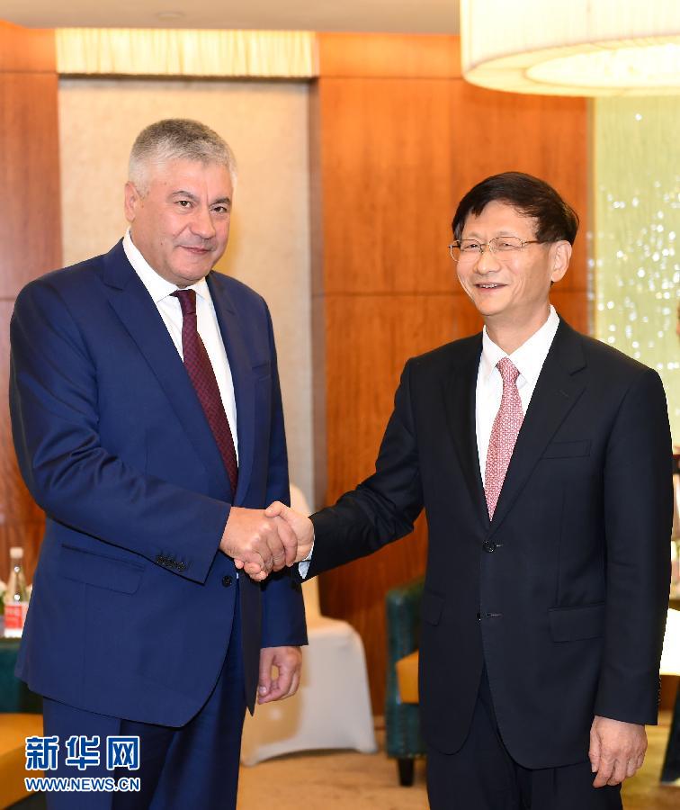 ??? 10月23日,中共中央政治局委員、中央政法委書記孟建柱在北京會見出席“安全促發展”中國東盟執法安全合作部長級會議的俄羅斯內務部部長科洛科利采夫。新華社記者張領攝