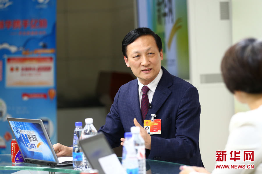 2015年3月13日,全國人大代表,北京大學第三醫院骨科主任及脊柱外科研究所所長劉忠軍做客新華會客廳。圖為劉忠軍與主持人交談。新華網 李江 攝