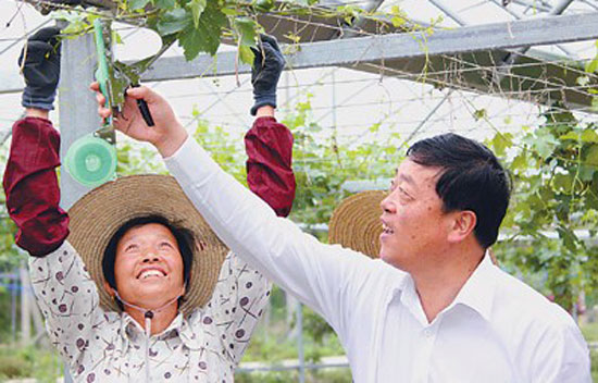 武繼軍(右)在查看村里的農業科技示范園。