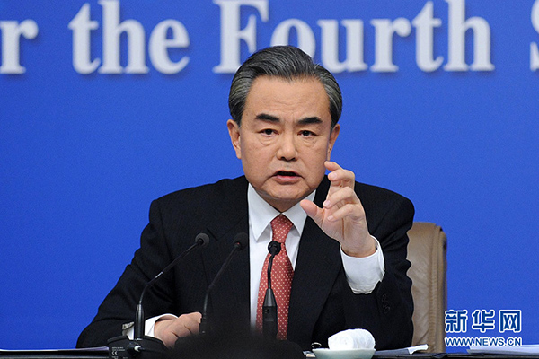 ????十二屆全國人大四次會議新聞中心于3月8日(星期二)10時在梅地亞中心多功能廳舉行記者會,邀請外交部部長王毅就“中國的外交政策和對外關系”的相關問題回答中外記者的提問。圖為外交部部長王毅回答記者提問。新華網(wǎng)/中國政府網(wǎng)記者 陳競超攝