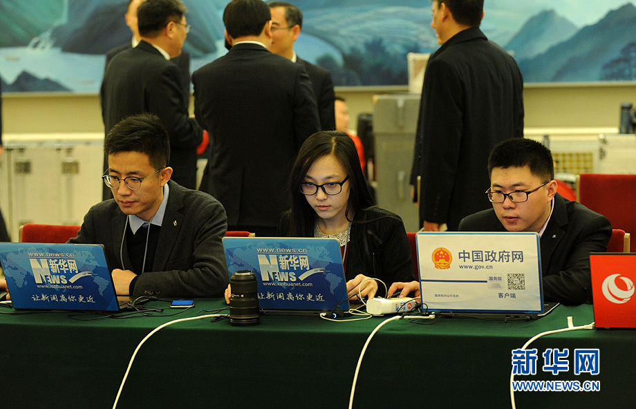 3月16日上午,國務院總理李克強在人民大會堂三樓金色大廳會見采訪十二屆全國人大四次會議的中外記者并回答記者提出的問題。圖為新華網、中國政府網記者在做直播準備。新華網/中國政府網 陳競超 攝