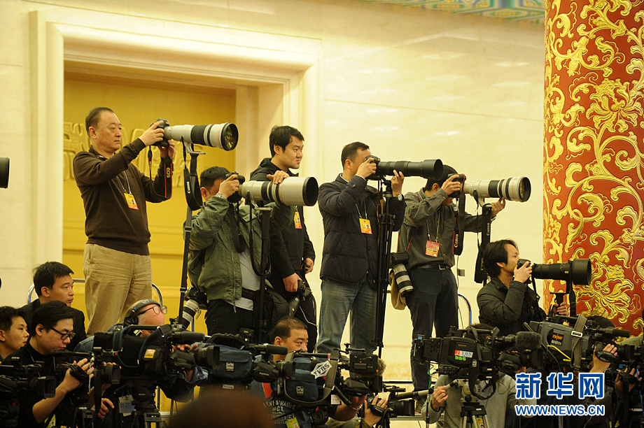 3月16日上午,國務院總理李克強在人民大會堂三樓金色大廳會見采訪十二屆全國人大四次會議的中外記者并回答記者提出的問題。圖為等待拍照的攝影記者。新華網/中國政府網 陳競超 攝