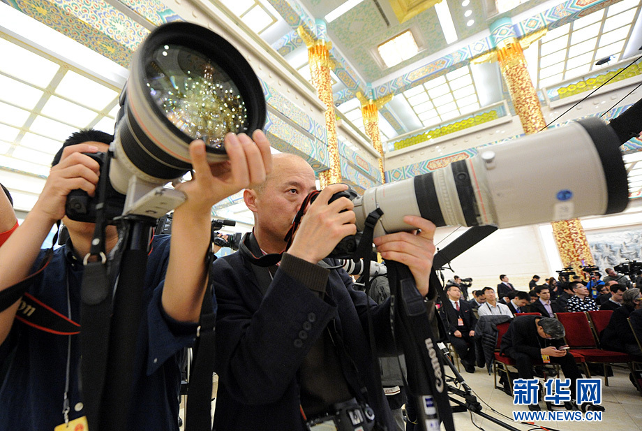 3月16日上午,國務院總理李克強在人民大會堂三樓金色大廳會見采訪十二屆全國人大四次會議的中外記者并回答記者提出的問題。圖為記者用多鏡頭拍攝記者會。新華網/中國政府網 陳競超 攝