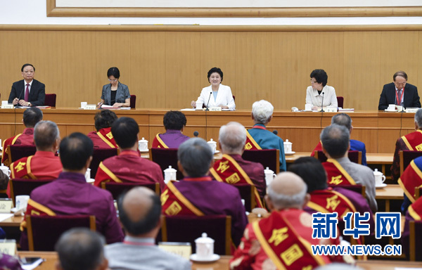 6月29日,中共中央政治局委員、國務院副總理劉延東在北京接見第三屆國醫(yī)大師和首屆全國名中醫(yī)代表并座談。 新華社記者 張領 攝