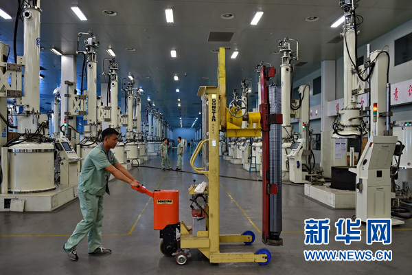 山西潞安集團太陽能科技有限責(zé)任公司的工人在搬運剛剛生產(chǎn)出的單晶硅棒(7月20日攝)。新華社記者 曹陽 攝