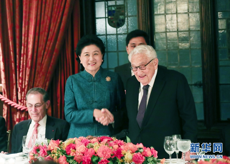 9月25日晚,中國國務院副總理劉延東在美國紐約應約出席基辛格博士為其舉行的晚宴。賓主雙方在輕松熱烈的氣氛中就促進中美友好交流等問題深入交換了意見。這是劉延東在晚宴上與基辛格握手。新華社記者 王迎 攝