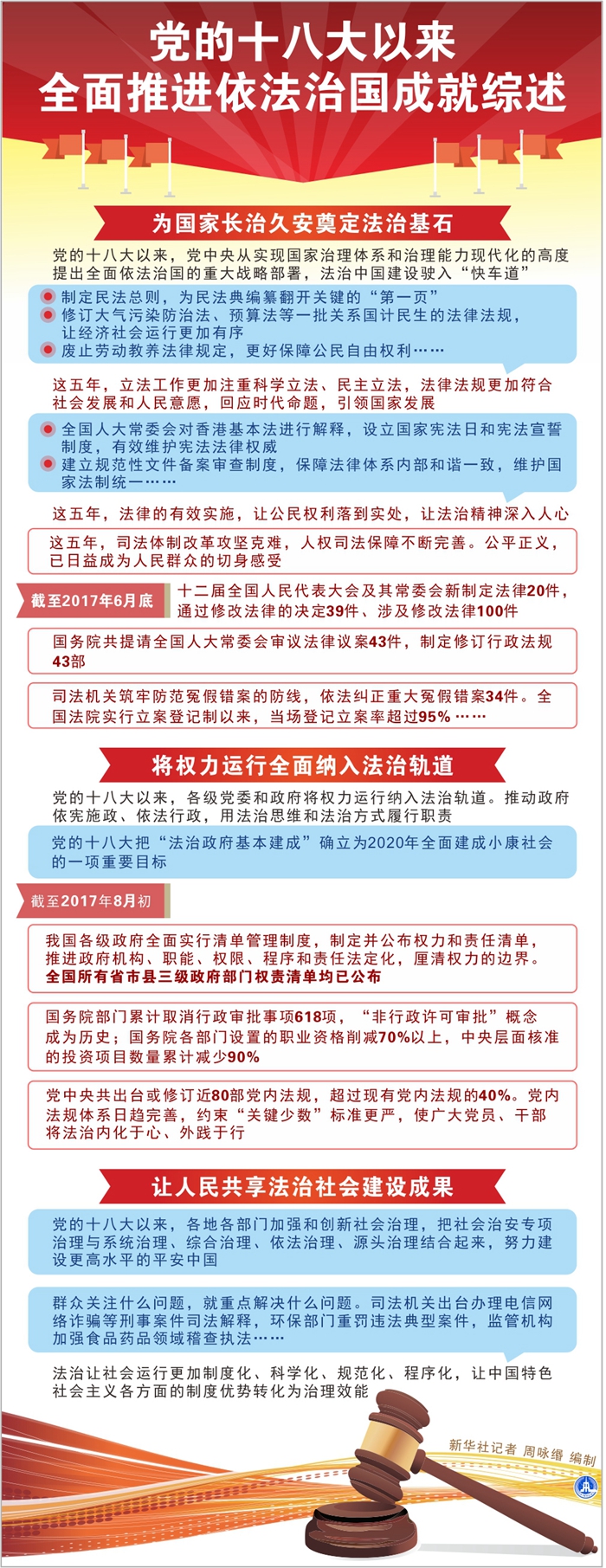 截至今年6月,十二屆全國人大及其常委會共制定法律20件,通過修改法律的決定39件;全國法院去年采取信用懲戒措施834.6萬人次,70.7萬名“老賴”主動履行義務,執行到位金額超過1萬億元;我國去年每10萬人中命案發案數僅為0.62起,已成為世界上最安全的國家之一。