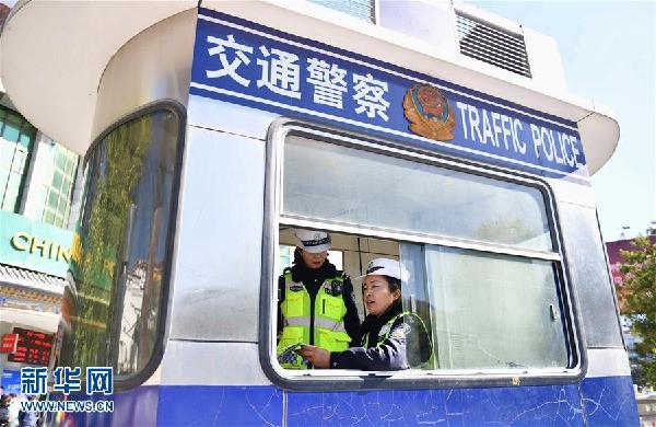 強巴卓瑪(右)和同事在拉薩布達拉宮腳下的交警崗亭執勤(11月2日攝新華社記者 晉美多吉 攝