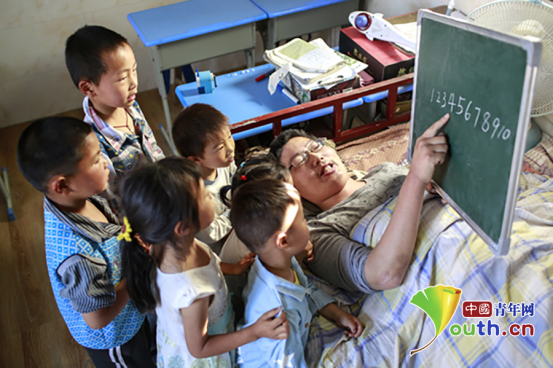 由于葉海濤的雙下肢關節僵直,沒有辦法筆直地坐著,他便躺在病床上,側著身子用小黑板給孩子們講解題目。可是這樣一來,躺的時間一旦久了,葉海濤的身體便會全都麻木,疼痛難忍。但他卻始終堅持著……最難熬的是夏季,他睡在板床上長時間保持同一個姿勢,全身都被汗水浸透了,額頭上黃豆般大小的汗珠不斷地冒出,滾落到板床上,床面已經被浸濕。常人都難以忍受,更何況是患病在床的葉海濤呢?在這種異常難受的狀態下,葉海濤憑借自己驚人的毅力,克服困難,十八年如一日,堅持為孩子們輔導功課。這份教學工作,是繁雜的,須深入學習、不斷鉆研,研究教學思路。為了更好地勝任這份輔導任務,他經常在空余時間閱讀有關教育方面的書籍。