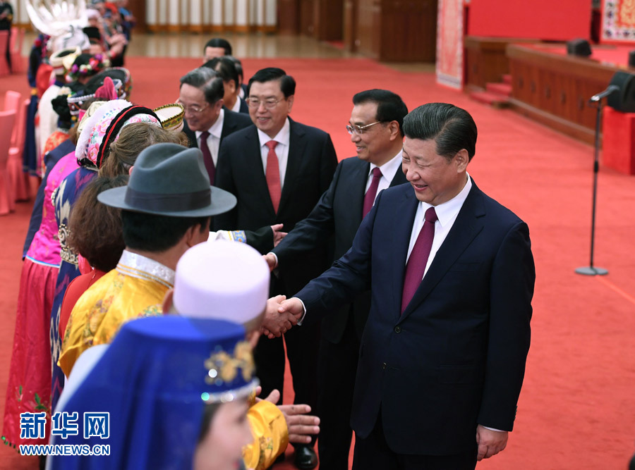 3月11日晚,中共中央統(tǒng)戰(zhàn)部、全國人大民族委員會、國家民族事務委員會、全國政協(xié)民族和宗教委員會在北京人民大會堂舉行茶話會,黨和國家領導人習近平、李克強、張德江、俞正聲、劉云山、王岐山、張高麗等與出席十二屆全國人大五次會議和全國政協(xié)十二屆五次會議的少數(shù)民族代表委員們歡聚一堂,共慶全國兩會勝利召開,共祝偉大祖國繁榮昌盛,共話中華民族美好未來。新華社記者 李學仁 攝