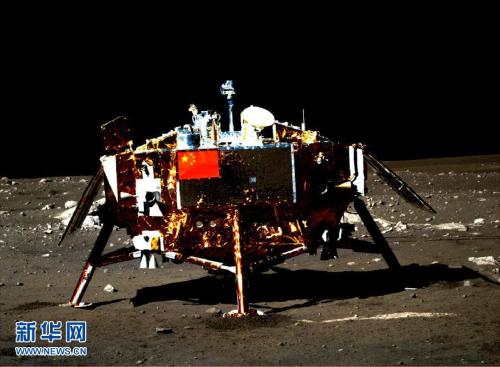 資料圖:嫦娥三號著陸器及器載五星紅旗圖片。該圖是由月球車上全景相機(jī)拍攝的。新華社發(fā)(國防科工局供圖) 圖片來源:新華網(wǎng)