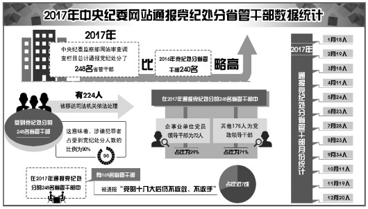 《法制日報》記者逐條梳理中央紀委監察部網站審查調查欄目信息統計,該欄目在2017年總計通報黨紀處分了248名省管干部,比2016年黨紀處分省管干部240名的數量略高。