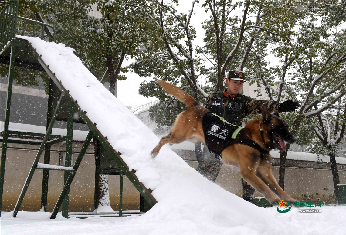 1月27日,武警安徽總隊(duì)機(jī)動支隊(duì)警犬班班長王營廣帶領(lǐng)警犬“魯克”通過障礙。