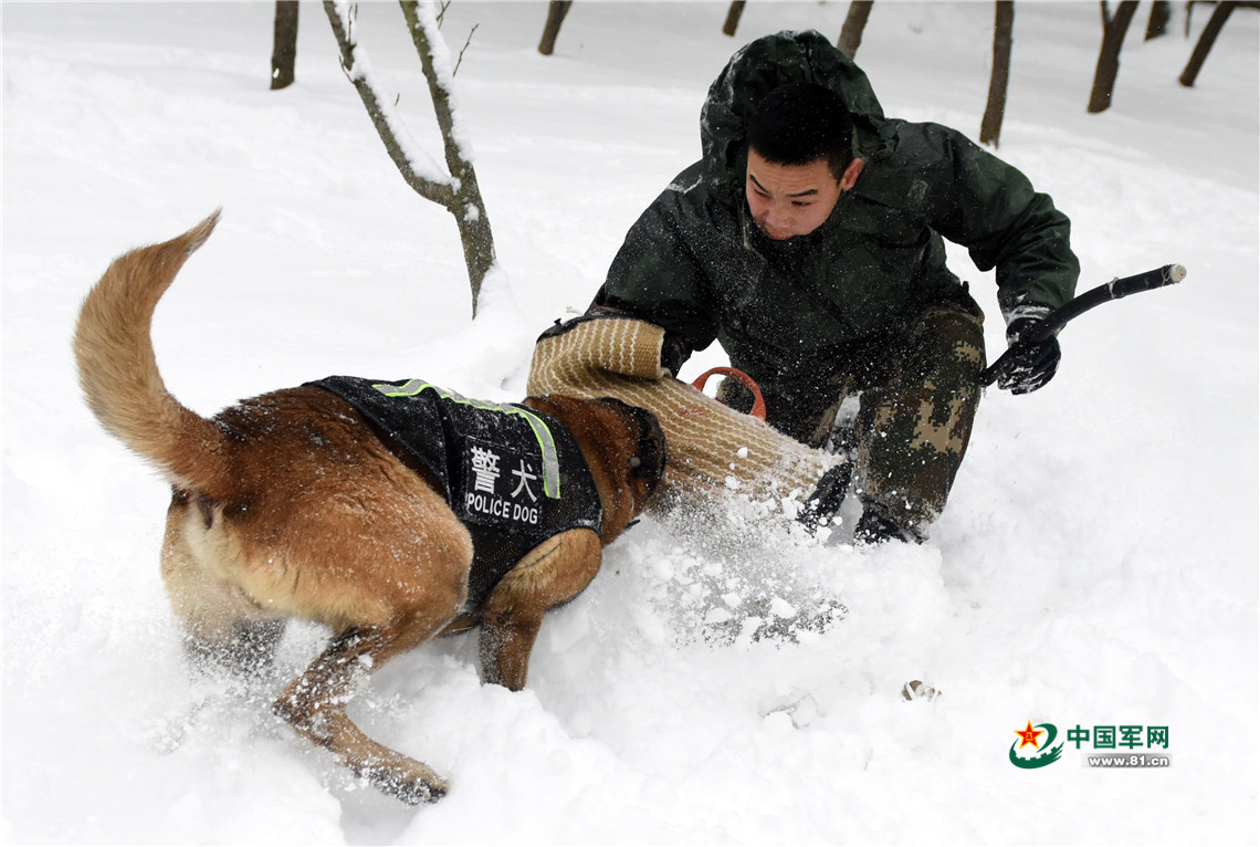 1月27日,武警安徽總隊機動支隊警犬班班長王營廣帶領(lǐng)警犬“魯克”進行撲咬訓(xùn)練。