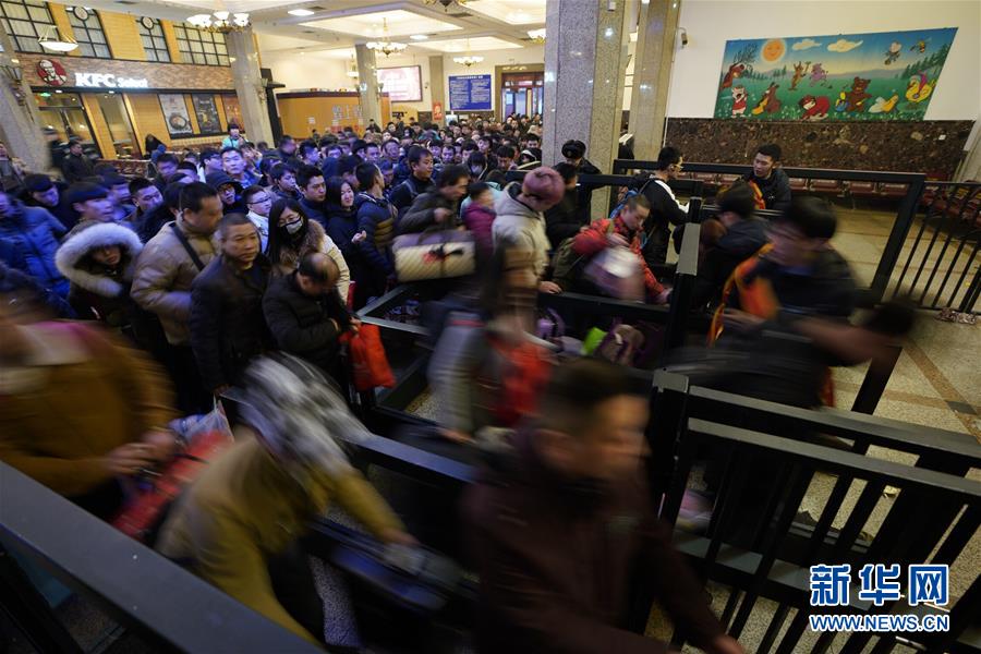 2月1日凌晨,乘坐由北京站發往重慶北站的3603次列車的旅客在北京站進站乘車。當日,2018年春運正式啟動。新華社記者 邢廣利 攝