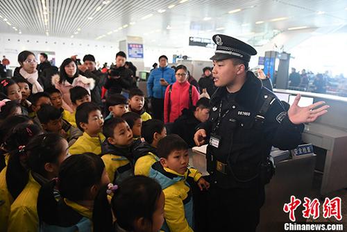資料圖:一名民警正在為小學(xué)生們介紹安檢須知。中新社記者 王遠(yuǎn) 攝